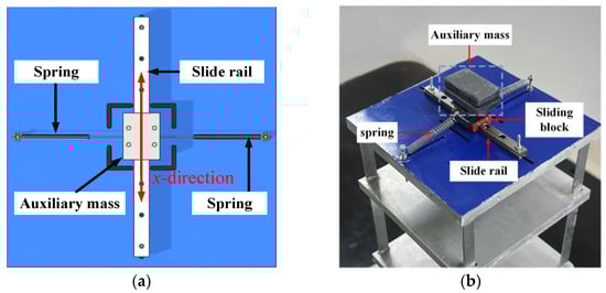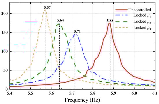 As shown in Figure 3a, the NES comprises a sliding rail, a pair of springs and an auxiliary mass, which can freely move along the x-axis. The NES was installed on the top floor of the model by rigid connection. The stiffness of the spring and auxiliary mass in the NES can be changed to investigate the vibration mitigation effects of the different parameters of the NES on the dynamic responses of the model under different excitations. Three sets of auxiliary mass, e.g., 100 g, 150 g and 200 g, were adopted in this research. The corresponding mass ratio μ, which is the ratio of the auxiliary mass of the NES to the mass of the structure, was μ1 = 3.0%, μ2 = 4.5% and μ3 = 6.0%, respectively. The stiffness of the NES was set as k1 = 105.0 N/m and k2 = 330.0 N/m, respectively. The variation in auxiliary mass of the NES changes the natural frequency of the structure–NES system, when the NES is locked. Figure 4 shows the frequency response function of the structure–NES system when the NES is locked. It indicates that the natural frequencies are 5.71 Hz, 5.64 Hz and 5.57 Hz when μ1, μ2 and μ3 are equal to 3.0%, 4.5% and 6.0%, respectively. Table 1 gives the first three natural frequencies of the system when the NES locked. The first three natural frequencies are decreasing as the masses of the system are increasing.