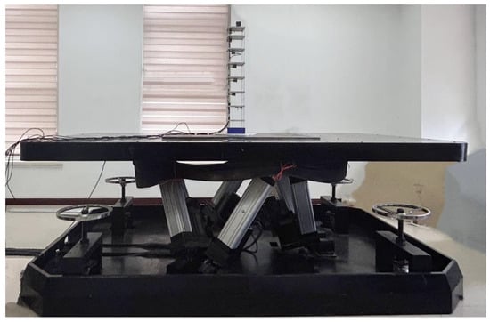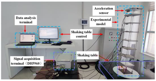 The MDOF of the structural model was installed on a shake table, which was controlled by a computer terminal, and accelerometers on the model and data acquisition device were used to measure and collect the dynamic responses of the model, as shown in Figure 5. The shake table has six degrees of freedom, and the platform is 2.5 m in length and 1.5 m in width. The range of working frequencies of the shake table is from 0.0 Hz to 30.0 Hz, and the parameters of the shake table are shown in Table 2. The model was installed on the shake table as shown in Figure 6. The time histories of the dynamic responses were measured by the accelerometers at 1000.0 samples per second.