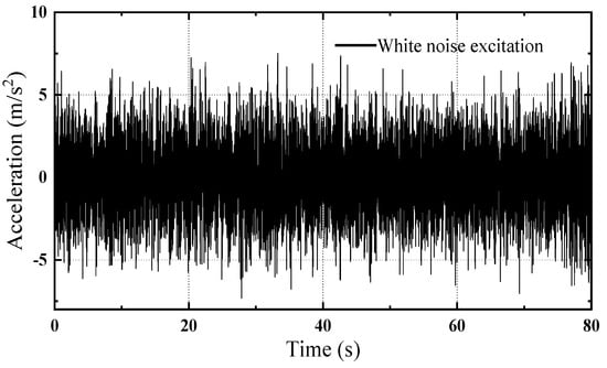 The NES and TMD controlling the dynamic responses of the MODF structure under the white noise excitations, with peak acceleration being 7.5 m/s2, as shown in Figure 7, were investigated in this section. Figure 8 presents the time history of acceleration responses on the top of the structure with and without NES or TMD installation under white noise excitations. Figure 8 indicates that the NES and TMD can dramatically decrease the acceleration responses of the structure compared with the uncontrolled structure.
