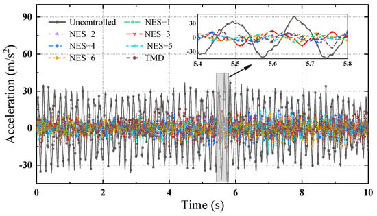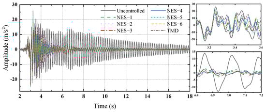 The time histories of the acceleration responses on the top of the structure with and without NES or TMD installation under the seismic wave are shown in Figure 19. Figure 19 demonstrates that the NES and TMD have no considerable vibration mitigation effects on the acceleration responses of the structure under the seismic wave press before 3.5 s, and the vibration mitigation effects begin to become significant after this time. The acceleration response of the uncontrolled structure reaches 12.5 m/s2 at 7.0 s. At this time, the responses decrease to 1.8 m/s2, 0.54 m/s2, 1.2 m/s2, 0.3 m/s2, 1.13 m/s2, 0.15 m/s2 and 0.66 m/s2 corresponding to the control conditions of NES–1~NES–6 and TMD, respectively. Among them, NES–6 has the best vibration mitigation effects, and its mitigation ratio is 98.8%.