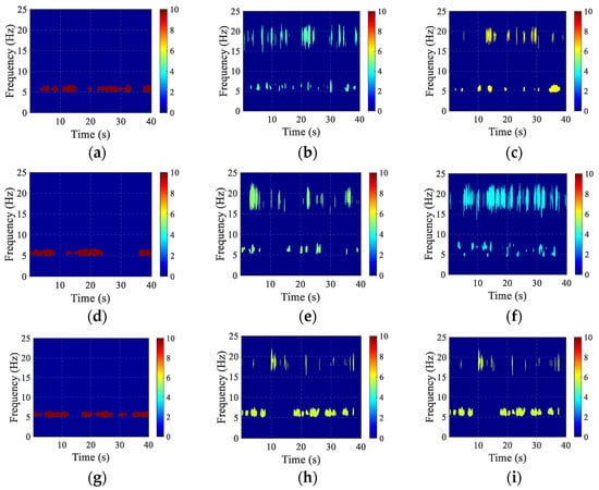Wavelet analysis of NES controlling dynamic responses under white noise excitation. (a) Locked NES–1 or –2, (b) NES–1, (c) NES–2, (d) locked NES–3 or –4, (e) NES–3, (f) NES–4, (g) locked NES–5 or –6, (h) NES–5, (i) NES–6.