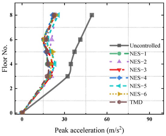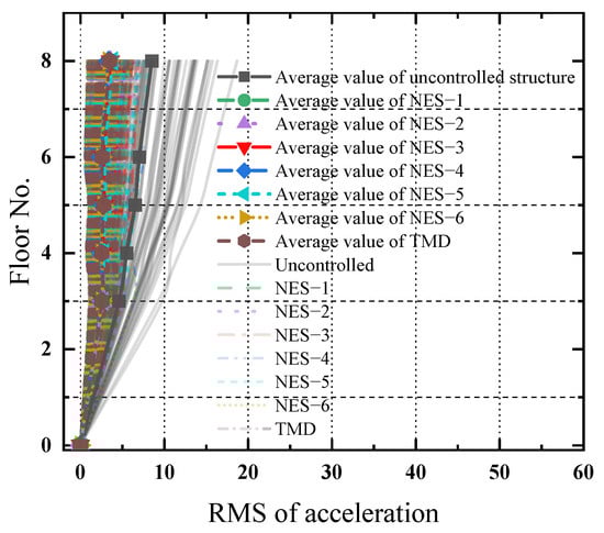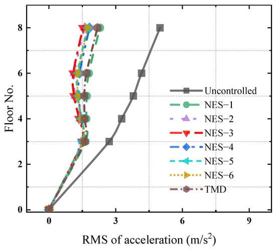 The RMS values of the time history of the acceleration responses along the height of the structure under the seismic wave were estimated to evaluate the vibration mitigation effects of these control devices, as shown in Figure 21. Figure 21 manifests that these control devices can effectively alleviate the RMS values of the dynamic responses along the height of the structure. Among them, NES–3 has the best vibration reduction effects. The RMS value is 4.99 m/s2 at the top of the uncontrolled structure. NES–1~NES–6 and TMD reduce the values to 2.3 m/s2, 1.6 m/s2, 1.52 m/s2, 1.82 m/s2, 1.73 m/s2, 1.74 m/s2 and 2.18 m/s2, respectively, and the corresponding vibration mitigation ratios are 54.1%, 67.8%, 69.4%, 63.5%, 65.3%, 65.0% and 56.3%.