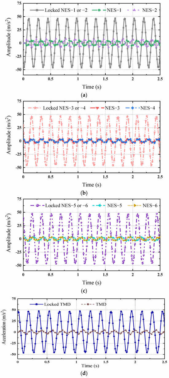 The vibration mitigation effects of the NES on the dynamic responses of the structure under harmonic excitation, the frequency of which is equal to that of the structure with the NES installation, were investigated in this section, as shown in Figure 12. It is noted that the frequency of harmonic excitation varies along the structure with the NES having a different mass ratio μ, which can change the natural frequency of the structure–NES system. Figure 13a–d present the time histories of the acceleration responses on the top of the structure when the NES or TMD is locked or unlocked. Both NES and TMD can decrease the amplitude of the dynamic responses from 50.0 m/s2 to 5.0 m/s2. Figure 13a–d indicate that both the NES with different parameters such as mass ratio μ and stiffness k and the TMD have the same vibration mitigation effects on the acceleration responses, except for NES–2, even though the mass ratio of the NES is smaller than that of the TMD. Figure 13 indicates that NES–2 has the worst vibration mitigation effects on the acceleration responses of the structure under harmonic excitations among these control devices. Its vibration mitigation ratio is 81.84%, as shown in Figure 13a.