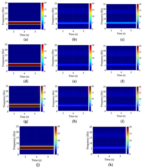 Wavelet analysis of NES and TMD controlling dynamic response under harmonic excitation. (a) Locked NES–1 or –2, (b) NES–1, (c) NES–2, (d) locked NES–3 or –4, (e) NES–3, (f) NES–4, (g) locked NES–5 or –6, (h) NES–5, (i) NES–6, (j) locked TMD, (k) TMD.