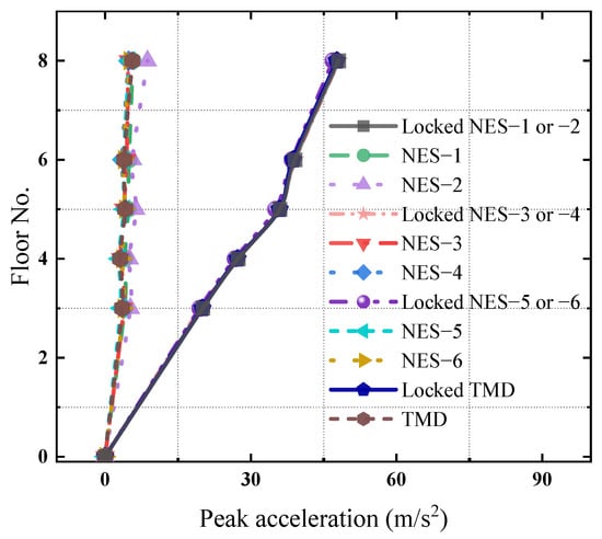 The time histories in Figure 13 can be transformed into the frequency and time domains by wavelet analysis to investigate the vibration mitigation effects, as shown in Figure 14. Figure 14a,d,g,j show that the energy of the structural dynamic responses entirely comes from the first vibration mode and does not vary with time, when the NES and TMD are locked. As shown in Figure 14b,c,e,f,h,i,k, when the NES and TMD work, the energy of the dynamic responses corresponding to the first vibration mode significantly decreases, while the higher vibration mode around 18.0 Hz begins to be involved in the vibration. Figure 14 demonstrates that the different NESs have the same vibration mitigation effects as that of the TMD except for NES–2, and the vibration mitigation effects of NES–2 are worse than those of the others. The variation in peak values of the time history in Figure 13 along the height of the structure can be calculated as shown in Figure 15. For the responses on the top of the structure in Figure 15, all control devices except for NES–2 achieved a vibration mitigation ratio of over 88%, and NES–3 and NES–4 exhibited the best mitigation effects at 90.1% and 90.0%, respectively, which is consistent with the results from Figure 13.
