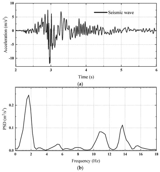 Seismic waves: (a) time history of one seismic wave and (b) PSD of one seismic wave.