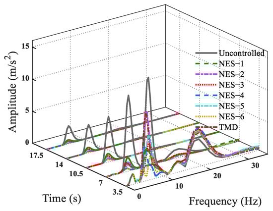 Through wavelet analysis, the time history in Figure 19 can be transformed into the frequency and time domain to investigate the vibration mitigation effects, as shown in Figure 20. Figure 20 shows that the dynamic responses mainly come from the first vibration mode, and the amplitude of dynamic responses corresponding to the first natural frequency around 5.88 Hz (the black line) decreases with time for the uncontrolled structure due to the values of stochastic excitations become smaller and smaller after 4.0 s, as shown in Figure 18a. It is clear that both NES and TMD can considerably decrease the structural dynamic responses corresponding to the first vibration mode, and do not affect the responses of the higher vibration modes, as shown in Figure 20.