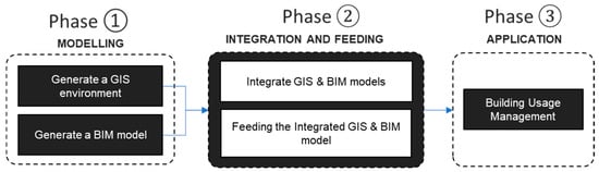 Figure 1 illustrates the proposed simulation methodology. It consists of the creation of the GIS-3D and BIM digital models (Phase 1), their integration and enrichment with accurate information (Phase 2), and finally, the development of a potential application of the integrated models (among many other possible applications) aimed at building management (Phase 3).