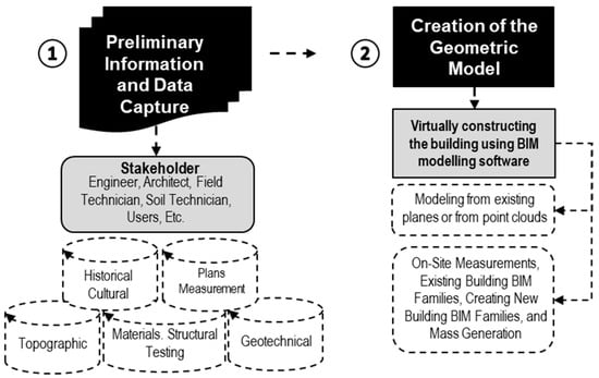 - Step ①—Preliminary information and data capture. In this step, existing building data are collected to create and populate the BIM model in the next step. The essential information for generating the model includes sketches, plans, measurements, mass position capture (LIDAR point clouds), technical data sheets on the composition of elements, access to family libraries, and more.