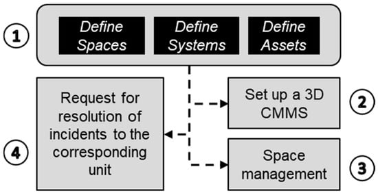 - Step ①—Define spaces, assets, and systems/subsystems, which are the key elements that govern the management of building use.