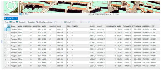 In Phase 1.1, the generation of the GIS-3D environment of the site involved using orthophotos as a base map and a digital terrain model with relief. To represent the latter, we worked with the point clouds from the LIDAR flights conducted for the 2012 National Aerial Orthophotography Plan of Spain (PNOA), which were used to generate the DTM. Both the orthophotos and the aforementioned point clouds were obtained from the “Mapas Cantabria-España” download center []. To develop the terrain definition and the footprint of the buildings, the cadastral base of the parcels for each site was utilized. This base, referred to in Spain as “constru”, is obtained directly from the Spanish Cadastre []. As shown in Figure 6, the 2D layer “constru” is associated with an attribute table containing information about the parcels, sub-parcels, and the polygonal shapes of the building footprints, which are essential data for developing the subsequent stages.