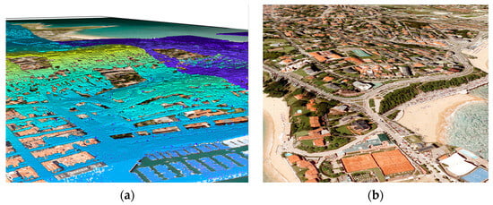 Since the site is considered to have a terrain with relief, it is necessary to create the DTM and the DSM. To achieve this, the points corresponding to the terrain in the point cloud from the LIDAR flight, shown in Figure 7a, are filtered out. These points are then combined with the orthophoto previously assigned through algorithms implemented in the GIS software (ArcGIS Pro), resulting in a terrain with realistic relief and texture, as shown in Figure 7b.
