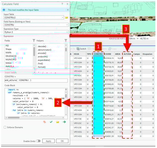To generate the GIS-3D environment of the buildings, the “constru” layer is used, which contains a field of the same name in its attribute table. This field describes the heights of each building (Figure 8, Step 1). The height is coded in Roman numerals (e.g., “I” indicates that the building is one story tall, “II” indicates two stories, etc.). However, since the height is not defined by a value in Arabic numerals, a numerical value in Arabic numerals must be assigned to the height variable (in this case, “constru”) in order to generate an extrusion. To achieve this, an algorithm is used (Figure 8, Step 2) that converts the heights defined in Roman numerals to heights represented on a numerical scale in Arabic numerals (Figure 5, Step 3). In this case, an average height of 3 m per floor has been adopted, ultimately generating the environment in LoD 1 (Figure 9).