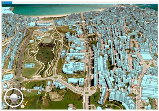 - Step ①—Data management and initial configuration. For “data management,” the first task is to define the semantic level (level of detail and type of terrain) that the GIS-3D model will have, as the management of the initial data and the configuration of the workspace will depend on this requirement. The initial data that must be managed to construct a model are as follows: (a) The cadastral database of the city’s parcels. This database is a 2D GIS layer that contains the municipal and cadastral attribute table, including specifications for the height of each floor of the buildings in the polygons. (b) Data related to the LIDAR (Laser Imaging Detection and Ranging) point cloud of the geographical area. Depending on the country or region, this initial data may or may not be previously available from public administrations; therefore, it is understandable that, in many cases, access to the initial data may require conducting a field campaign for its generation. The initial configuration of the workspace refers to the management and definition of the base map that will contain the GIS platform. This map can be an orthophoto, a street map, or a simple canvas with a solid color.