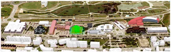 To obtain a level of detail (LoD) 2, a function is automated to recognize the height of the buildings in the Digital Height Model (DHM) and the height difference between the highest points of the buildings (roofs), thereby defining the slope of the roofs. To achieve a LoD 3 level of detail, a more realistic representation must be assigned to the building envelopes. For this, multipatch features are used, which are GIS objects that store a collection of patches or triangles to represent the boundary of a 3D object. This approach allows texture to be introduced to the buildings through photographs taken of the facades and roofs, or by directly editing the envelope of each building to represent the details of the elements that compose it. Figure 10 shows the models in LoD 2 combined with LoD 3. The LoD 4 level will be achieved with the BIM building to be integrated at a later stage.
