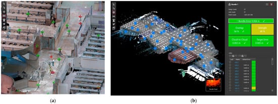 To develop Step ①, Preliminary Information and Data Capture, the process was organized into three parts: (1) positioning work with a topographic station, (2) capture work with laser scans, and (3) capture work through photogrammetry. The positioning work was carried out with a Leica TS13, 5″, robotic total station (Leica Geosystems, St. Gallen, Switzerland), with a total of 10 stations set up around the exterior of the building (facades and intermediate decks). For laser scanning inside the building, a Leica Geosystems BLK360 was used. To georeference the scans, 6″ circular targets were employed, Figure 11a. Considering the specifications of the scanner and the building, 48 scans were deemed adequate. Leica’s Reality Capture software (Register 360 version 2022 and Cyclone 3DR version 2022) was used to process the laser scan data, generating a total of 79 links, Figure 11b. The 48 scans were linked “cloud-to-cloud”, resulting in a combined point cloud. The merged cloud was then registered in the project’s reference system. During the scanning of a building, factors such as cloud cover, fog, smog, birds, etc., can affect the quality of the results. For this reason, the scans were conducted (after consulting weather forecasts) on days when these natural light conditions were not expected to be an issue. In this case, there was no interruption caused by birds; however, there were trees in front of the building’s façade, which were considered during the classification of the point cloud.