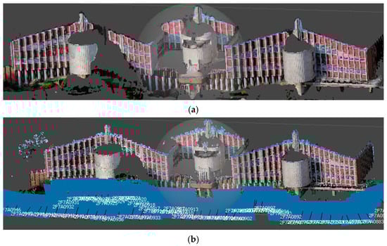 Finally, to generate the photogrammetric model of the building, as shown in Figure 12a, a Canon EOS 5DS R digital camera (Canon Inc., Tokyo, Japan) with 40.6 megapixels and lenses of various fixed focal lengths (28 mm, 35 mm, and 50 mm) were used. A total of 948 images were captured (Figure 12b). Before capturing the images, homogeneously distributed targets were positioned. Additionally, natural points that were easily identifiable in the images were observed on the building and used as control or check points. The office work was conducted using the data captured through photographic techniques. The software used for this work was Agisoft Metashape Pro, version 1.8. All the project images were oriented with a ground pixel size (GSD, Ground Sample Distance) of 3.6 mm.