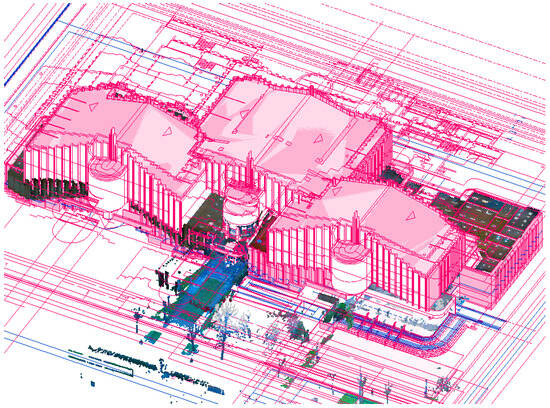 In Model 2, with the aim of not modeling all the elements of the building from scratch, the focus was on readjusting the elements of the lower levels of Model 1, which were created previously using Revit 2019, while taking the point clouds as a reference. This approach enhanced Model 1, making Model 2 an accurate geometric representation of the actual building. Since the point cloud was properly referenced, it was necessary to configure certain parameters in Revit 2019, such as the project location, elevation, and the actual north of the project relative to the north of the BIM software’s drawing space. Next, the different levels (heights of the building) were created and positioned; these levels serve as the working planes within the BIM software, allowing the elements of the model created from plans to be adjusted to the dimensions of the point cloud template. Once the process of referencing and locating the levels was completed, the elements of the model were realigned to correspond with the point cloud (Figure 14). The time taken to generate the model turned out to be longer than we expected; therefore, we concluded that the time required to create a model will always depend on the availability of BIM families in the modeling software and the required level of development (LOD). As such, it is not possible to accurately estimate the modeling time for unique existing buildings like the one in this case study.