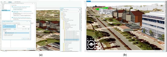 Integration of Revit model to ArcGIS Pro. (a) Georeferencing and (b) integrated model.