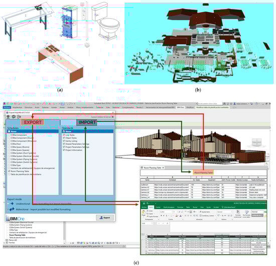 Preliminary feeding of the BIM model of the Civil Engineering School. (a) Examples of the creation and editing of furniture and equipment families with Revit. (b) Equipment of the ground floor of the building (own elaboration with the eveBIM software version 4.2.4.585 []) (c). Planning table in Revit for the Faculty of Civil Engineering and its linkage/export to an Excel sheet.