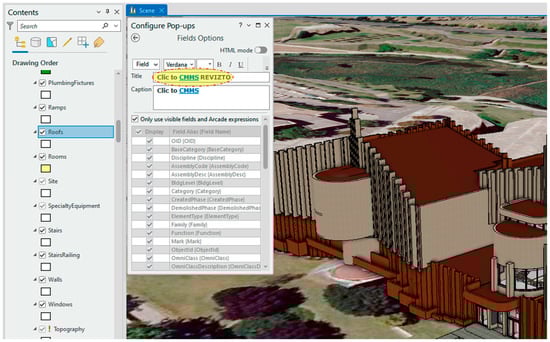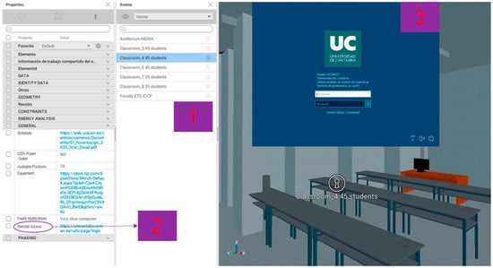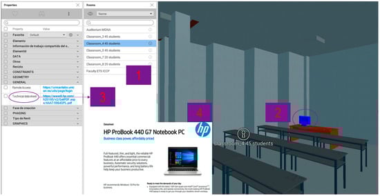 Step ① defined the spaces, assets, and systems/subsystems used in this simulation. Specifically, the teaching classrooms, computer equipment, study areas located in corridors, departmental areas, and the exhibition area were identified. In Step ②, the CMMS Revizto (Spanish version) was configured, which allows for 3D navigation with the capability of generating three-dimensional annotations in the model, as well as the interaction and scheduling of these annotations with the various stakeholders involved. To do this, the Revit model (*.rvt) was first linked to Revizto (Figure 17). Next, a link was established in the GIS-3D and BIM model within ArcGIS Pro through the attributes of the elements; thus, clicking on one of these elements displays a pop-up within the GIS-3D environment, allowing for instant access to the Revizto CMMS (Figure 18).