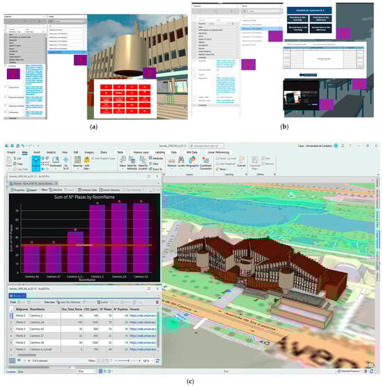 In Step ③, the implementation of space management for some of the most important services provided by the Civil Engineering School was simulated, specifically concerning the management of teaching classrooms. For this purpose, these spaces were configured to access information related to the academic activities conducted within them. Thus, through the shared BIM parameters of the developed virtual 3D model, a wide variety of information can be accessed, such as the calendar hosted on the server (Figure 19a) or links to attend video conferences/online classes (Figure 19b), as shown in steps 3–5. To monitor classroom occupancy capacity, a GIS control panel was configured, as shown in Figure 19c. An Excel spreadsheet was created and linked to the BIM model, which was then integrated into the 3D GIS model along with the BIM model. The Excel spreadsheet is populated with data (parameters) regarding the classrooms, specifically the number of available seats in each classroom. Next, an analysis chart is constructed by selecting one of the options available in ArcGIS Pro, ensuring that it represents the desired attributes of the family and/or space to be monitored (in this case, classrooms). A bar chart was chosen because it allows for a parallel comparison of the occupancy capacity of the classrooms.