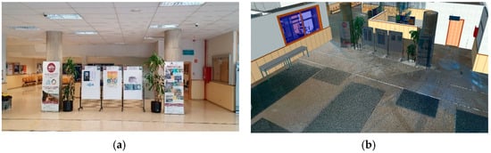 Change in the exhibition area in the hall of the Civil Engineering School. (a) A real photograph. (b) The BIM model with a point cloud overlay created 1 week before the real photograph.