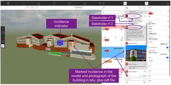 In Step ④, which involves requesting the resolution of incidents and faults from the corresponding unit, the model is ideal for traceability tasks because it allows for the locating of maintenance or work requests as annotations in the 3D model. For example, a correction request was simulated regarding the installation of the “50th Anniversary” sign for the Civil Engineering School of Santander. Thus, the person in charge interacted with the correction regarding the placement of the sign, sharing documentation throughout the process, both on-site (using a mobile device) and in the office (through the desktop application), with all the management actions being recorded and stored in real time (Figure 25).