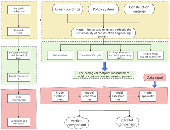 The technology route and framework is comprised of three major parts: (1) research background and research questions: identifying research gaps by summarizing and demonstrating the current status of research on sustainability in the construction industry with the aim of proposing an evaluation method that can quantify the degree of sustainability of an individual construction project; (2) theoretical foundation, methodology and model development: drawing upon the outcomes of prior research, this part establishes an ecological footprint assessment model for individual construction projects from the perspectives of stakeholders, the whole life cycle, ecological footprint and engineering ecology and (3) case application and result analysis: validating the applicability and precision of the measurement model through practical case applications, and at the same time, due to the depth of the investigation, putting forward the current limitations of the thesis as well as the direction of future research.