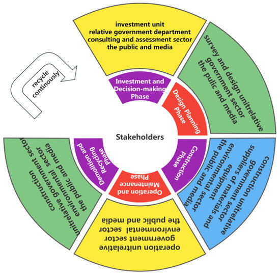 According to the two types of stakeholders identified in Table 1, five types of dominant stakeholders can be considered as the main trunk, while six types of auxiliary stakeholders can be seen as the branches. In accordance with the principle that different stakeholders enter and exit at different stages of a construction project, the whole life cycle of a construction project is segmented into five sections: the investment and decision-making phase, the design planning phase, the construction phase, the operation and maintenance phase and the dismantling and recycling phase, as depicted in Figure 2.