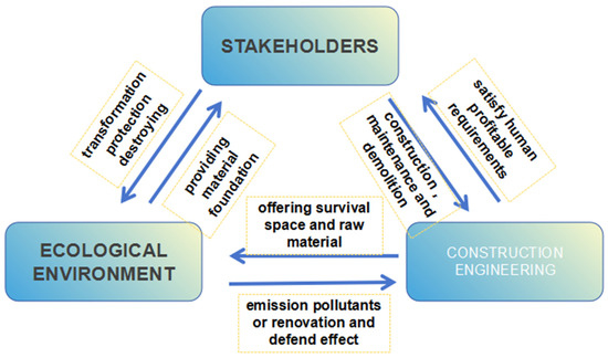 Stakeholders are given the corresponding necessary survival conditions by the natural ecological environment. Construction projects, while fulfilling stakeholder requirements through functional objectives, will cause some interference to the natural ecological environment or may discharge certain hazardous pollutants into the ecological environment at the same time. The ecological environment is not only supplying the material conditions for stakeholders and construction but affording double environmental damage pressure from two factors. The specific performance of relationships among the main entities of the construction ecosystem is shown in Figure 3.