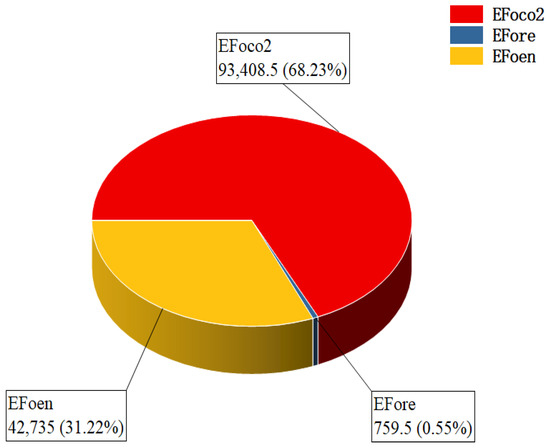 The consumption of energy and resources (primarily fossil energy consumption) and the generation of major wastes (CO2) in this stage constitute a minor portion of the project’s entire life cycle, and the corresponding ecological footprint is also comparatively small. Therefore, we can employ a proportional value of the ecological footprint from the construction phase to represent it. Under the circumstance, it is straightforward to calculate without ignoring the impact of its ecological footprint on the whole life cycle of the project. This proportionality coefficient is called the conversion factor [55,57], and is denoted by the symbol θ.