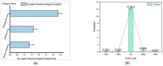 (a) The value of per capita annual ecological footprint of specific areas and (b) the value of the per capita annual ecological footprint of Quzhou stadium during each life phase.