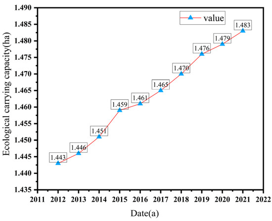 According to prior literature, both the ecological footprint and ecological carrying capacity have shown continuous growth over the past few decades [73,74], but the annual average increase for the former is greater than that for the latter, with rates of 5% and 0.44%, respectively. Moreover, along with the ecological footprint rising rapidly, Zhejiang Province’s ecosystem is confronted with a critical situation. The fluctuating trends of the per capita annual ecological carrying capacity in Quzhou City over the last decade are depicted in Figure 9.