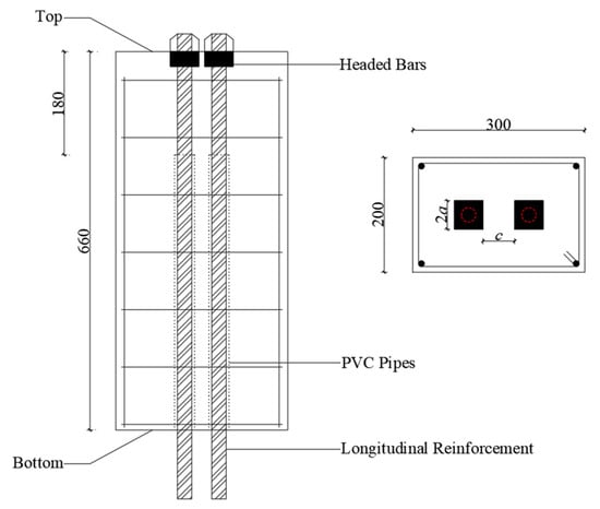 The size of the specimen is 200 mm × 300 mm, and the height is 660 mm. Each specimen is placed with two headed bars. The size of the headed bars is 50 mm × 50 mm, and the thickness is 20 mm. In order to avoid the fracture of the stressed longitudinal reinforcement before the local compression failure of concrete, the prestressed threaded reinforcement with the standard yield strength of 1080 MPa is selected. According to the JGJ256-2011 (Technical Specification for Application of Headed Bars) [], the nominal area of the reinforcement with the headed bars should not exceed 4.5 times the area of the headed bars, and the nominal diameter of reinforcement d in the specimen is selected as 25 mm. The effective embedded length of reinforcement lah in concrete specimens is 180 mm, and the remaining length of the steel bars inside of the concrete specimens is wrapped with pvc pipe. The illustration of the pull-out specimen is shown in Figure 1.