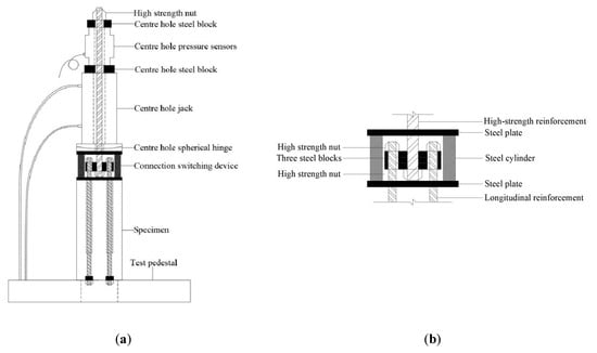 The test setup used for the specimen is composed of a test pedestal, a connection switching device, a center-hole spherical hinge, a center-hole jack, a center-hole pressure sensor, and a high-strength nut. The test setup used for the specimen with multiple headed bars is shown in Figure 2a. The connection switching device can convert two longitudinal steel bars, which are stressed at the same time, into one steel bar. The illustration of the connection switching device is shown in Figure 2b. The loading mode for the pull-out test involves the center-hole jack lifting the cylinder upwards, while a high-strength nut secured at the top restricts the jack’s displacement and transmits the upward pressure to the prestressed threaded steel bar via the connection switching device, thereby pulling the steel bar out until the specimen fails.