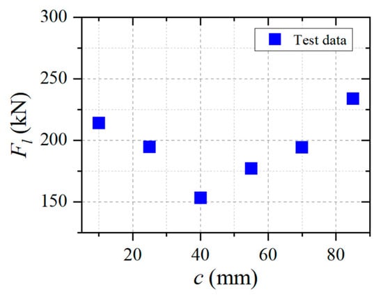 Considering that when the specimen reaches the limit state, the local bearing capacity of concrete under individual headed bars is affected by the tensile stress in its own tensile region and the tensile stress in the other tensile region, it is necessary to re-determine the ft of Equation (18). This is because when c ≥ 40 mm, the local bearing capacity of the specimen was calculated according to the individual calculation model. Therefore, when c = 40 mm, the tensile stress in the tensile region of concrete under individual headed bars is consistent with the other individual headed bars. With the linear increase in c, the circumferential tensile stress in the tensile region under individual headed bars keeps increasing linearly, while the tensile stress in the tensile region under the other headed bars keeps decreasing linearly, until the stress in the tensile region under two headed bars does not overlap, and the tensile stress in the tensile region of concrete under the headed bars reaches the limit state and returns to ft. The Fl value recalculated by ft1, the test value, and γ (the ratio of the test value to the calculated value) are shown in Table 8.