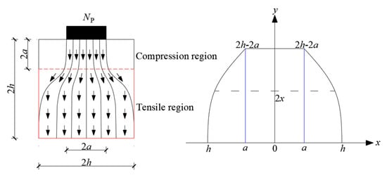The stress distribution model is analyzed using a cube model. The size of the model is 2h × 2h × 2h, and the side length of the headed bars is 2a. When the model is subjected to local compression, the stress under the headed bars diffuses some distance before it can be diffused to the full cross-section. During this diffusion process, the local compression-affected area of concrete under the headed bars forms a compression region and a tensile region. The height of the compression region is the side length of the headed bars 2a. The tensile region is the stress diffused to the full cross-section of the specimen in the form of an umbrella, and the height of the tensile region is 2h − 2a. The stress distribution of the local compression of model is shown in Figure 4. The distribution form of the outermost stress curve in the tensile region of the specimen is simplified into a quadratic parabola, which is expressed in a Cartesian coordinate system, as shown in Figure 5.