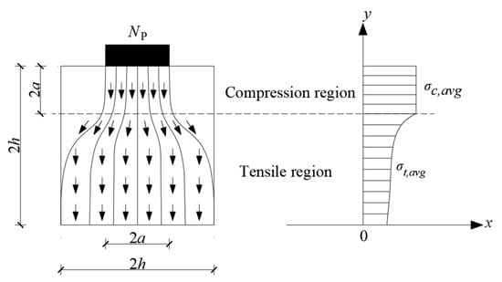 When the stress of the model diffuses to the full cross-section under local compression NP, the full cross-section area is the concrete area for distributing the bearing. So, h is 3a. By further simplifying Equation (1), the stress curve equation is obtained as follows: