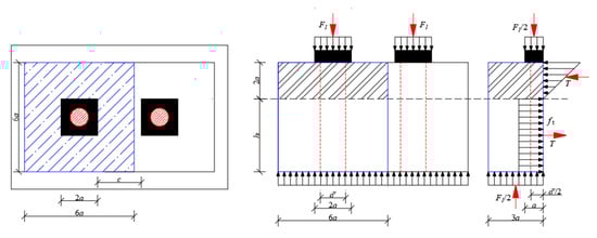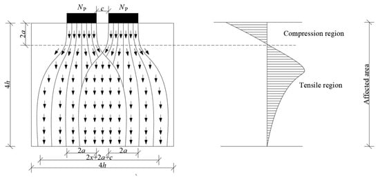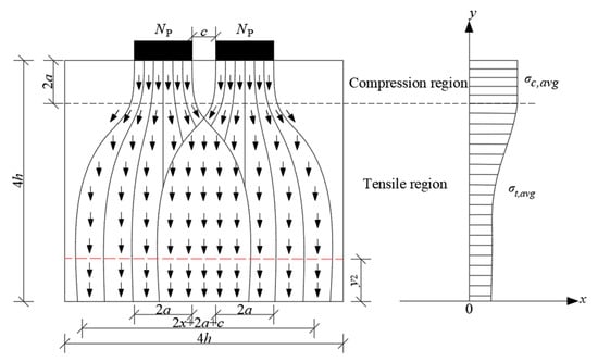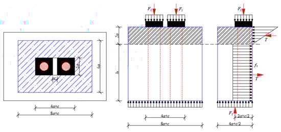 With the increase in c, the influence of horizontal compressive stress on the concrete between two headed bars is less, and the concrete under two headed bars and between them do not work as a whole. The local bearing capacity of the concrete of each specimen is calculated separately according to individual headed bars. Similarly to the integral calculation model, the concrete stress distribution when the specimens reached the limit state was analyzed, and half of the specimens were taken as isolated bodies. The individual calculation diagram of the concrete is shown in Figure 10.
