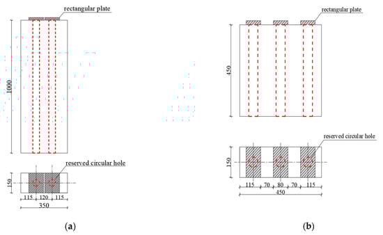 To verify the integral calculation model, eight pieces of test data were collected. The type of headed bars is a rectangular plate, the size of the rectangular plate is 110 mm × 150 mm, the thickness of the rectangular plate is 20 mm, and there is a reserved circular hole with a diameter of 50 mm under the plate. The dimensions of specimen with the rectangular plate are shown in Figure 11a.