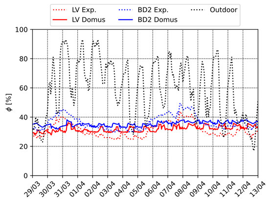 Relative humidity from experimental data (Exp.) against numerical modeling (DOMUS) in two zones: living room (LV) and bedroom 2 (BD2).