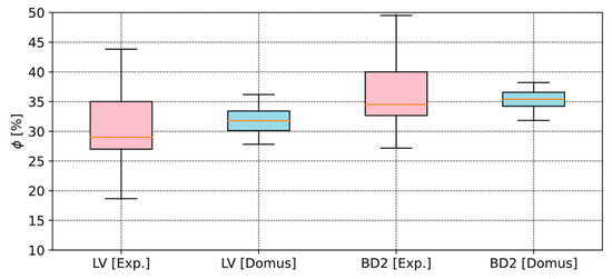 Boxplot of the relative humidity from experimental data (Exp.) against numerical modeling (DOMUS) in two zones: living room (LV) and bedroom 2 (BD2).