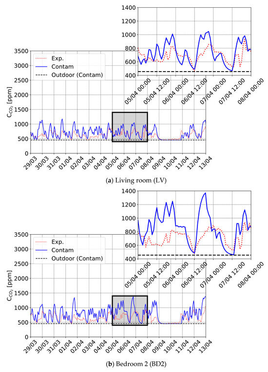 CO2 concentration from experimental data (Exp.) against numerical modeling (CONTAM) in two zones: (a) living room (LV) and (b) bedroom 2 (BD2).