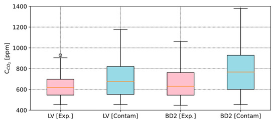 Boxplot of the CO2 concentration from experimental data (Exp.) against numerical modeling (CONTAM) in two zones: living room (LV) and bedroom 2 (BD2).