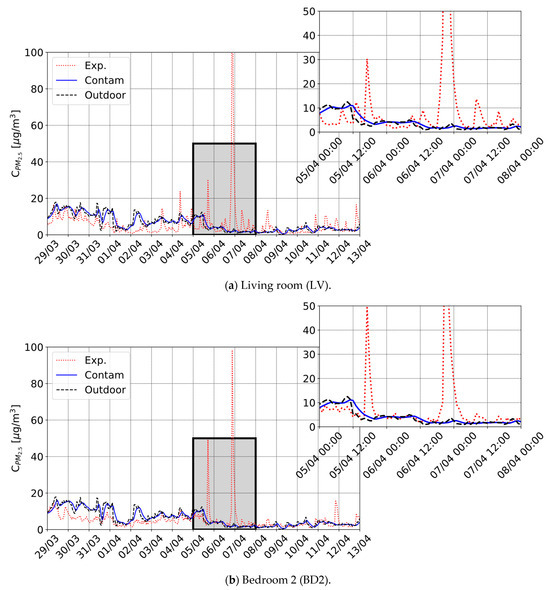 Figure 9 represents the outdoor and indoor PM2.5 concentrations in the LV and BD2, as measured and modeled by CONTAM. The outdoor concentration was in the range 0–18 μg·m−3. Each external peak corresponded to an internal peak in the measured and modeled concentrations. Notably, PM2.5 concentrations exceeding 10 μg·m−3 were more prevalent in the living room than in BD2, especially in the measured data where internal sources existed (contrary to the simulation). This discrepancy can be attributed to the proximity of the kitchen for the measured data, an internal source of fine-particle generation, affecting the living room more prominently than the bedroom. These indoor sources are not modeled in CONTAM, so it is assumed that the peaks observed inside are not obtained in the simulations and that the simulated indoor PM concentration follows the outdoor concentrations with a time lag. The higher emission rates observed in the measurements on April 5th and 6th afternoons were attributed to candle burning, as noted in the survey, highlighting a limitation of the modeling, which struggles to accurately represent these and other indoor emission rates resulting from occupant behavior.