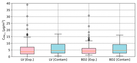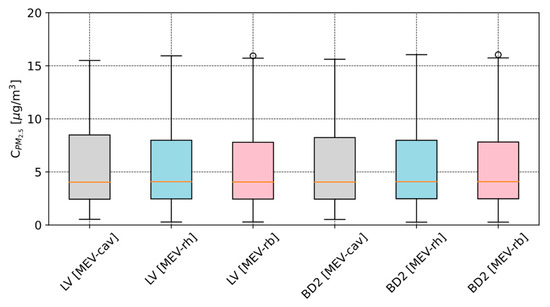 Figure 10 compares the measured and modeled PM2.5 concentrations in the LV and BD2 using boxplots. In the LV, the median value for measured PM2.5 concentration was 3.7 µg·m−3, while the modeled concentration was 4.7 µg·m−3 (+27%). On the other hand, in BD2, the median values were 4.2 µg·m−3 for the measured PM2.5 concentration and 4.7 µg·m−3 (+12%) for the modeled PM2.5 concentration. On average, the LV recorded PM2.5 concentrations of 5.8 µg·m−3 (measured) and 6.2 µg·m−3 (modeled), while BD2 showed concentrations of 5.3 µg·m−3 (measured) and 6.2 µg·m−3 (modeled). These concentrations fall within 0–15 µg·m−3 for the measured PM2.5 in the LV and 1–19 µg·m−3 for the modeled PM2.5 in BD2.