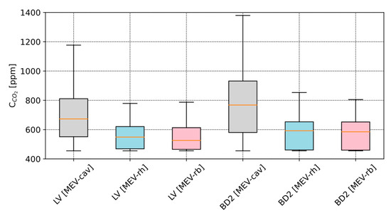 CO2 from reference ventilation strategy (MEV-cav) against smart ventilation strategies (MEV-rh and MEV-rb) in two zones: (a) living room (LV) and (b) bedroom 2 (BD2).