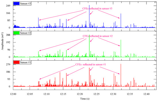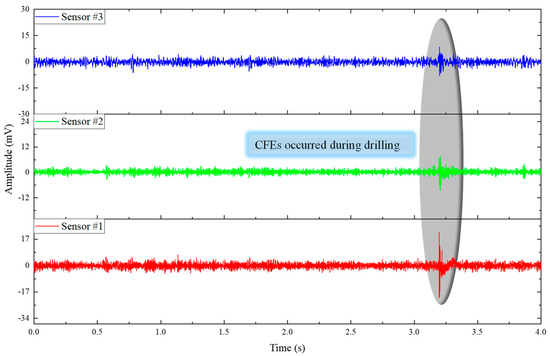 Amplitude curve of three sensors with time (including CFEs) during UPRD drilling.