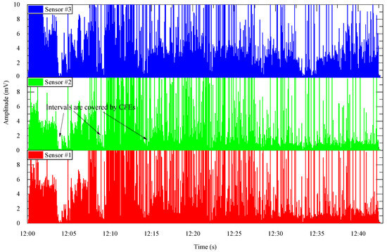 In order to more intuitively observe the changes in vibration signals with drilling status, a curve of vibration intensity over time should be created, as the results in Figure 3, which denoted the changing trend of the amplitude of the three sensors with time in the process of drilling. The results showed that a large number of CFEs were received by the three sensors, and the events completely changed the way the original amplitude changes (the amplitude of CFEs was mostly larger than the foundation amplitude level, thus masking the useful amplitude cluster), which led to the result that it was impossible to judge the depth of the borehole (the fact was fully confirmed by the reduction of ordinate range in Figure 4, which reduced the vertical ordinate range). The CFEs received by the three sensors were basically generated at the same time, and the relative amplitude changes were consistent, which confirmed the monitoring accuracy of CFEs. The maximum amplitudes of the three sensors were basically the same (between 245 and 290 mV), and there was no obvious attenuation phenomenon affected by the distance, which may be related to the smaller sensor spacing (especially when the CFE display occurred in the middle of sensor 2#, its amplitude was actually the highest. This may be due to some measurement errors, but fortunately, only one CFE was like this, which did not affect the basic rules). The emergence of CFEs has led to the inability to obtain depth parameters and has caused some errors in the subsequent statistical analysis of amplitude per meter, which was evident. But it also brought convenience to the research work of CFEs, which has rarely been analyzed in depth in previous studies. The main doubts lay in the principles, distribution patterns, and release effects of CFEs, and the basic data in this study provided an important foundation for answering these questions.